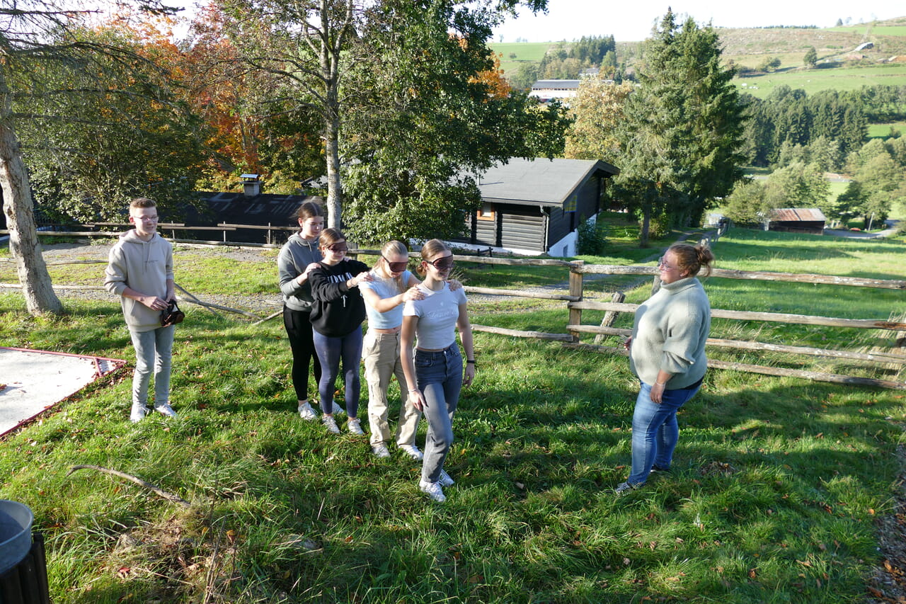 „Wer erklärt diese Übung?“, fragt Jugendreferentin Franziska Schneider. Marcels Finger schießt in die Höhe. Der 14-Jährige erklärt den anderen Mitgliedern der Gruppe, was sie an dieser Station zu bewältigen haben: Sie müssen sich die Augen verbinden, in einer Reihe aufstellen und an den Schultern festhalten. Nur die letzte Person kann sehen und führt die anderen über die Wiese – ohne zu sprechen, nur mit Berührungen an der Schulter. Franziska Schneider erklärt: „Wir wollen nicht eingreifen. Außer bei Gefahr, da greifen wir immer ein.“ Vertrauen und Teamarbeit sind maßgeblich. Wie fühlt sich die Situation an? Für die Teilnehmenden? Für den Spielleiter? Was hätte besser laufen können? Im Anschluss an die Aufgabe wird das gemeinsam reflektiert.
