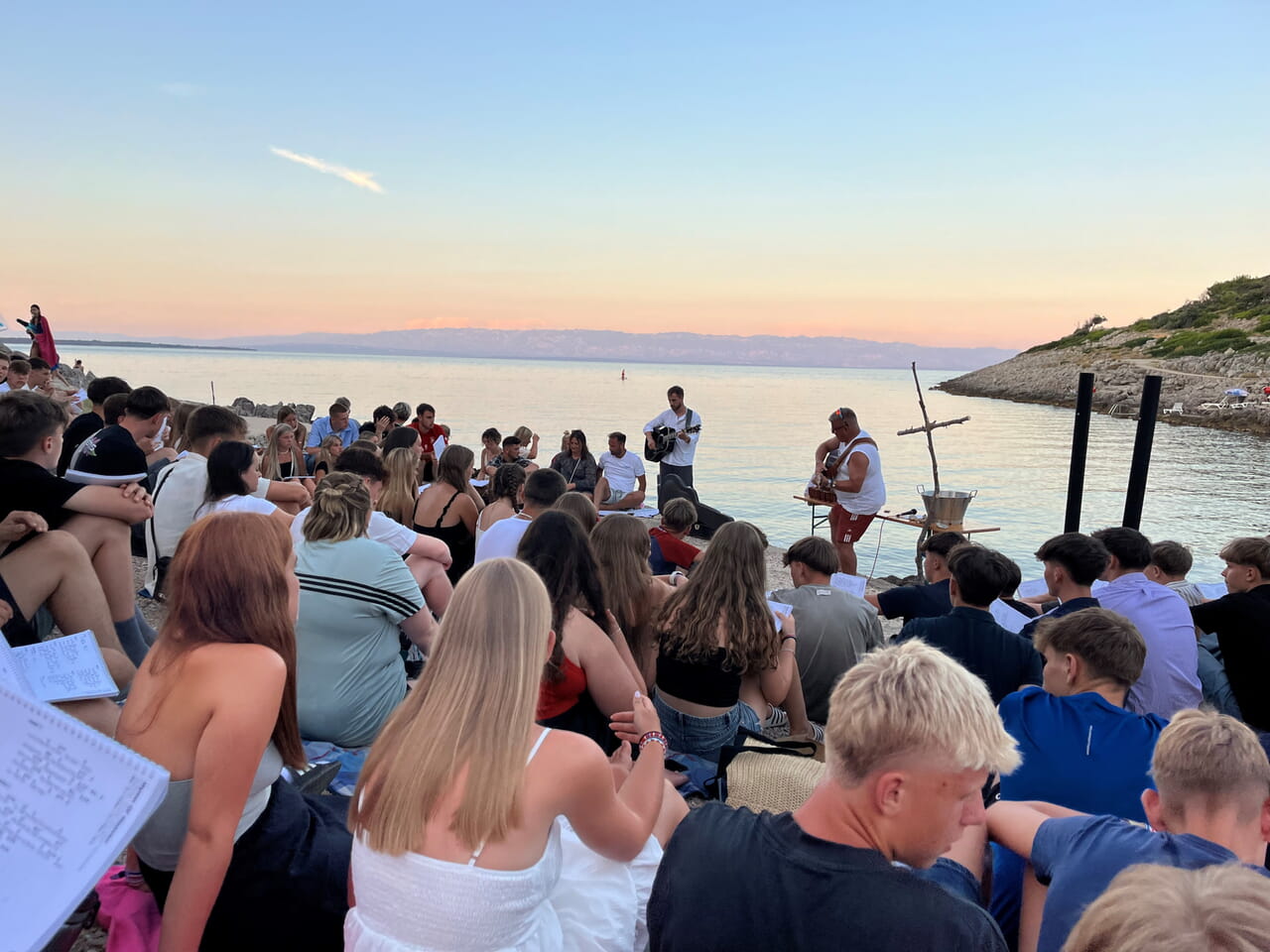 Frisch gestärkt ging es dann nach dem üppigen Frühstück weiter. Taschengeldkasse eröffnen, freiwillige Morgenandacht mit ganz viel Singen, Einkäufe planen und die alltäglichen Abläufe regeln, an denen sich dann jede/r orientieren kann. Das spielt sich in der Regel schnell ein und so konnten wir über die 14 Tage ein abwechslungsreiches Programm absolvieren: die Kreativangebote wurden im Überfluss genutzt, das Volleyball- und Fussballturnier unter großer Beteiligung und trotz großer Hitze durchgeführt, jeden Tag 4 – 5 Einkaufswagen in den Sprinter ein- und im Camp wieder ausgeladen, gekocht, gegessen und gespült (ein besonderer Dank an die Küche). Inzwischen war auch unser Wasserlieferant Darko aus Rijeka eingetroffen mit den ersten 130 Gallonen á 19 Liter, die nach einer guten Woche bereits geleert waren und ausgetauscht wurden. Am Ende der Freizeit waren dann ca. 4.500 Liter Wasser durch unsere Wasserspender in die eigens mitgebrachten Trinkflaschen gelaufen und damit auch der Umwelt ein großer Dienst erwiesen. In 2 Gruppen haben wir der istrischen Metropole Pula einen Besuch abgestattet (incl. Stadtführung) und der Bootsausflug mit allen incl. Essen an Bord, Badestopp auf der Insel Susak und exzessiver Sprungeinlagen von der Reling war für alle ein riesiges Vergnügen. Ein ordentliches Gewitter – in Kroatien eigentlich Pflicht – konnte uns dann auch nicht mehr schocken.