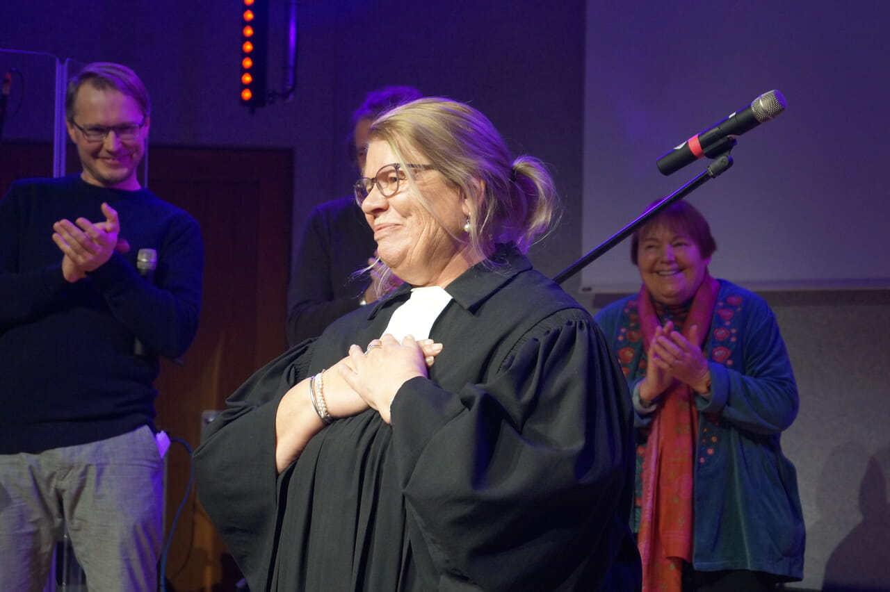 Volker Peterek, Leiter des Referats für Jugend und Gemeindepädagogik, unterstrich dies in der Vita von Juliane Hees-Kolb mit den Worten: „Du hast immer, naja bestimmt meistens, gerne gearbeitet.“ Begonnen hatte die heutige Gemeindepädagogin am 1. Januar 1987 in der damaligen Evangelischen Johannis-Gemeinde Siegen. „Es war die Zeit der Schulterpolster, Dauerwelle, Modern Talking und noch keine Spur von Fachkräftemangel“, sagte Peterek und ergänzte: „Im Gegenteil, sie gehört zu den Boomerjahren am Arbeitsmarkt. Daher startete Juliane Hees-Kolb zunächst mit einer Probebeschäftigung. Aber, wir stellen heute fest, es ging deutlich darüber hinaus!“ Neben dem Abschluss als Diplom-Sozialpädagogin folgten ein Studium an der Fachhochschule Bochum, die Fortbildungen „Hallo Adam – Hallo Eva“ und die Bibliodrama-Leitung und schließlich die Ausbildung zur Prädikantin. Seit 2010 ist Hees-Kolb Teil des hauptamtlichen Teams im Solidarraum 4. Zahlreiche Gruppenstunden, Angebote und Projekte für Kinder und Jugendliche hat sie verantwortet. Debatten und Diskussionen geführt. „Im Zentrum der Arbeit stand immer die Nächstenliebe zu den Kindern, Jugendlichen, Ehrenamtlichen, Familien und die Verkündigung von Gotte Liebe zu den Menschen“, so Peterek.