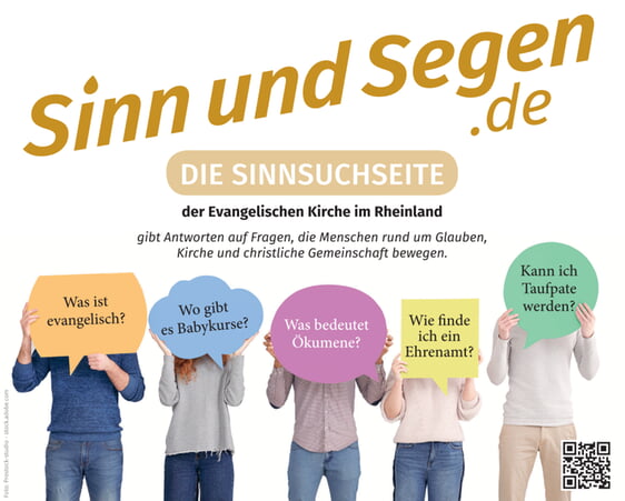 Haben Sie schon mal gegoogelt, was Sie zu einer Tauffeier anziehen sollen? Wie ein Konfirmationsgottesdienst abläuft? Was typisch evangelisch ist? Oder wo es Hilfe in schwierigen Situationen gibt? Dann sind Sie bei sinnundsegen.de genau richtig. Das neue Webangebot der Evangelischen Kirche im Rheinland antwortet auf Fragen, die das Leben stellt – und nach denen häufig im Internet gesucht wird. So bietet sinnundsegen.de Wissenswertes zu den Themen Glauben, Kirche und christliche Gemeinschaft: zu kirchlichen Feiertagen, zu Trauung, Taufe, Beerdigung sowie zu kirchlichen Angeboten für Jung und Alt – und das in einer modernen, ansprechenden Form. Die Webseite sinnundsegen.de ist ein zusätzliches Angebot zu ekir.de, der offiziellen Seite der Evangelischen Kirche im Rheinland.